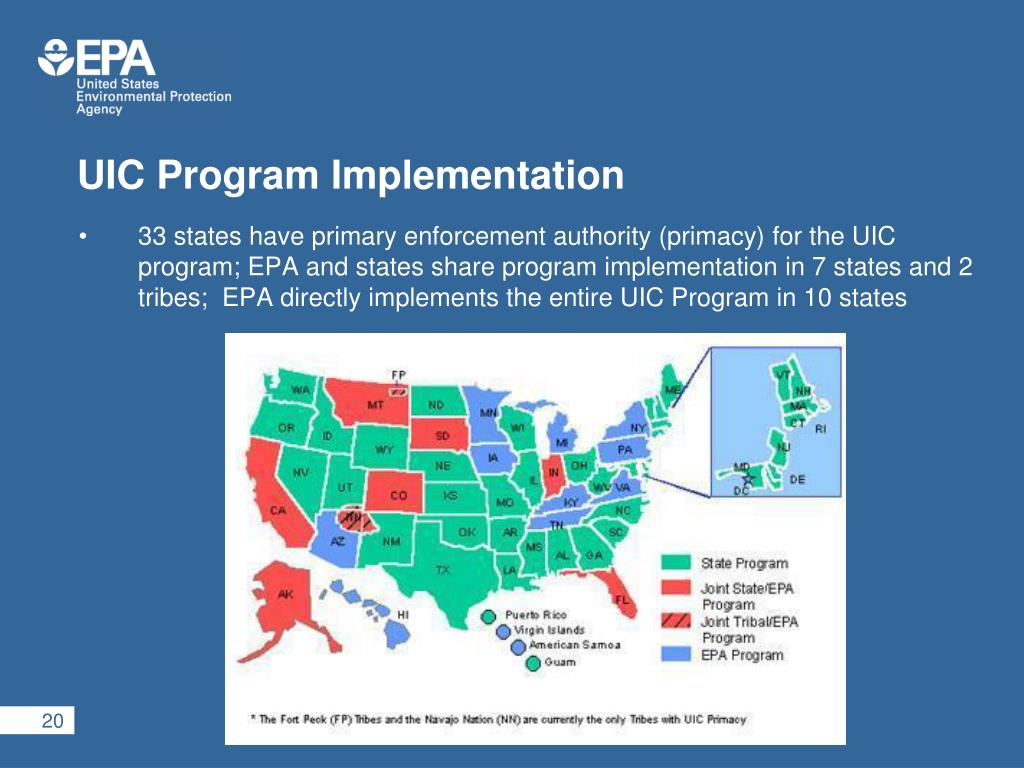 UIC Program Implementation • 33 states have primary enforcement authority (primacy) for the UIC program; EPA and states share program implementation in 7 states and 2 tribes; EPA directly implements the entire UIC Program in 10 states