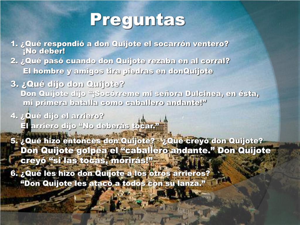 Preguntas 1. ¿Qué respondió a don Quijote el socarrón ventero? ¡No deber! 2. ¿Qué pasó cuando don Quijote rezaba en al corral? El hombre y amigos tira piedras en donQuijote 3. ¿Qué dijo don Quijote? Don Quijote dijo “¡Socórreme mi señora Dulcinea, en ésta, mi primera batalla como caballero andante!” 4. ¿Qué dijo el arriero? El arriero dijo “No deberás tocar.” 5. ¿Qué hizo entonces don Quijote? ¿Que creyó don Quijote? Don Quijote golpea el “caballero andante.” Don Quijote creyó “si las tocas, morirás!” 6. ¿Qué les hizo don Quijote a los otros arrieros? “Don Quijote les atacó a todos con su lanza.”