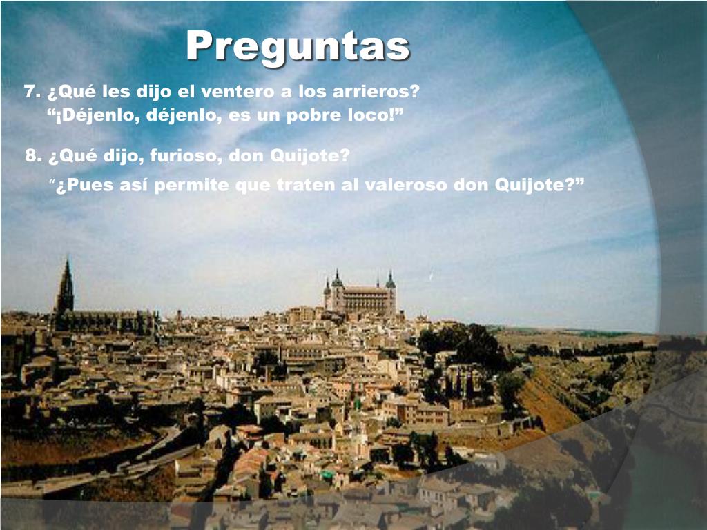 Preguntas 7. ¿Qué les dijo el ventero a los arrieros? “¡Déjenlo, déjenlo, es un pobre loco!” 8. ¿Qué dijo, furioso, don Quijote? “¿Pues así permite que traten al valeroso don Quijote?”
