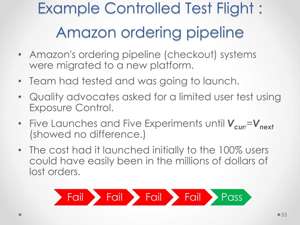 Example Controlled Test Flight : Amazon ordering pipeline • Amazon's ordering pipeline (checkout) systems were migrated to a new platform. • Team had tested and was going to launch. • Quality advocates asked for a limited user test using Exposure Control. • Five Launches and Five Experiments until Vcurr=Vnext (showed no difference.) • The cost had it launched initially to the 100% users could have easily been in the millions of dollars of lost orders.