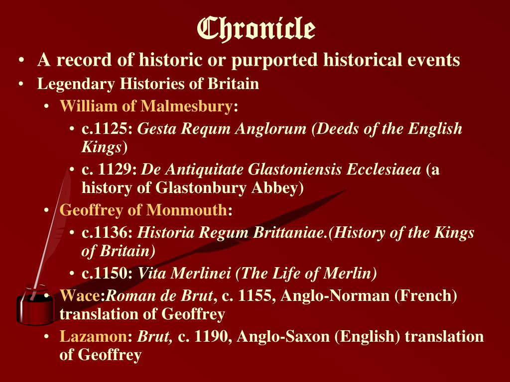 Chronicle • A record of historic or purported historical events • Legendary Histories of Britain • William of Malmesbury: • c.1125: Gesta Requm Anglorum (Deeds of the English Kings) • c. 1129: De Antiquitate Glastoniensis Ecclesiaea (a history of Glastonbury Abbey) • Geoffrey of Monmouth: • c.1136: Historia Regum Brittaniae.(History of the Kings of Britain) • c.1150: Vita Merlinei (The Life of Merlin) • Wace:Roman deBrut, c. 1155, Anglo-Norman (French) translation of Geoffrey • Lazamon: Brut, c. 1190, Anglo-Saxon (English) translation of Geoffrey