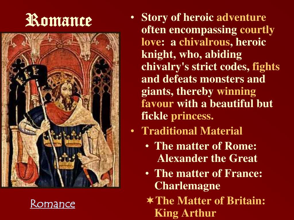 Romance • Story of heroic adventure often encompassing courtly love: a chivalrous, heroic knight, who, abiding chivalry's strict codes, fights and defeats monsters and giants, thereby winning favour with a beautiful but fickle princess. • Traditional Material • The matter of Rome: Alexander the Great • The matter of France: Charlemagne • The Matter of Britain: King Arthur Romance