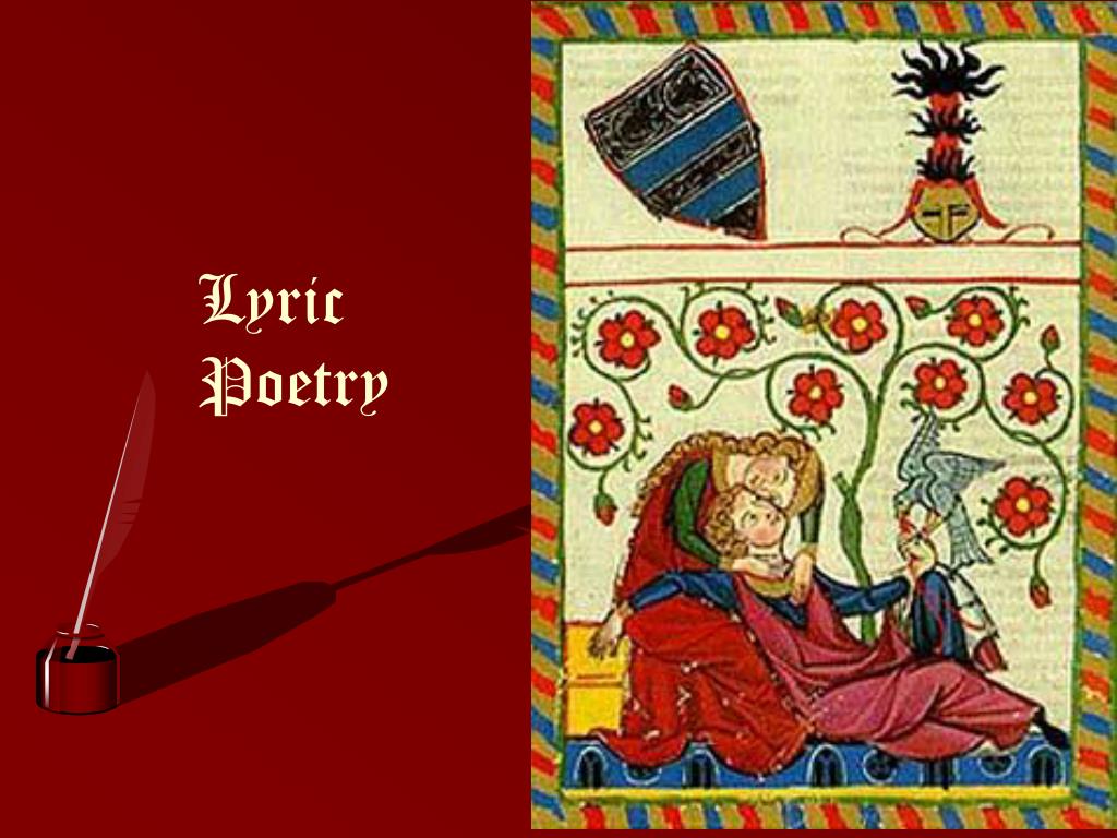 Secular Lyric Poetry • Ballades: poems with at least three stanzas having the same rhyme and metrical schemes and repeating the same last line: refrain • Complaints • Reverdies: spring songs • Rounds and Dances • Love Songs • Courtly Love • Aubades: poem or song about lovers parting at dawn “summer is icumen in”