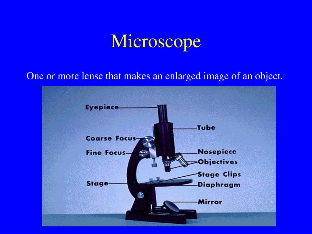 Microscope Notes. Microscope. One or more lense that makes an enlarged image of an object. Types of Microscopes. Simple Compound Stereoscopic Electron. Simple Microscope. Similar to a magnifying glass and has only one lense. Compound Microscope.