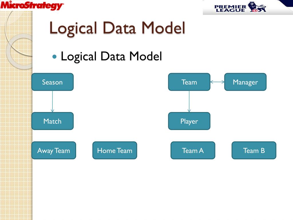 Logical Data Model • Logical Data Model Season Manager Team Match Player Away Team Home Team Team A Team B