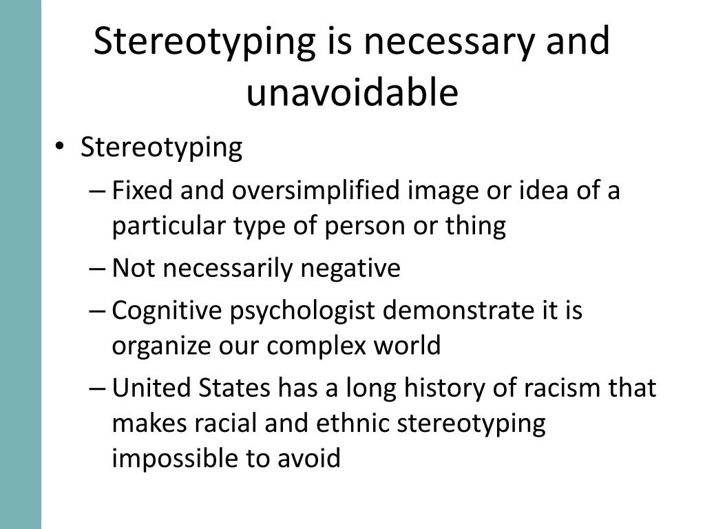 Stereotyping is necessary and unavoidable • Stereotyping • Fixed and oversimplified image or idea of a particular type of person or thing • Not necessarily negative • Cognitive psychologist demonstrate it is organize our complex world • United States has a long history of racism that makes racial and ethnic stereotyping impossible to avoid