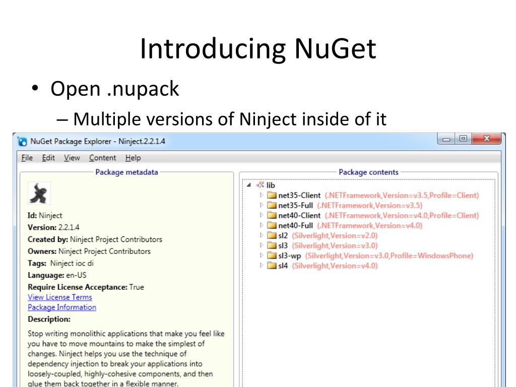 Introducing NuGet • Open .nupack • Multiple versions of Ninject inside of it