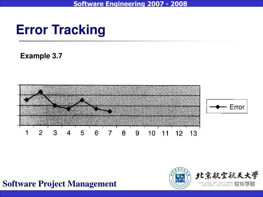 Error Tracking Example 3.7 Consider the following error data (given as the times between errors): 4, 3, 5, 6, 4, 6, 7. The instantaneous error rates are the inverses of the inter-error times: 0.25, 0.33, 0.20, 0.17, 0.25, 0.17, and 0.14. Plotting these against error number gives a download curve. This suggests that the actual error rate is decreasing. Software Project Management