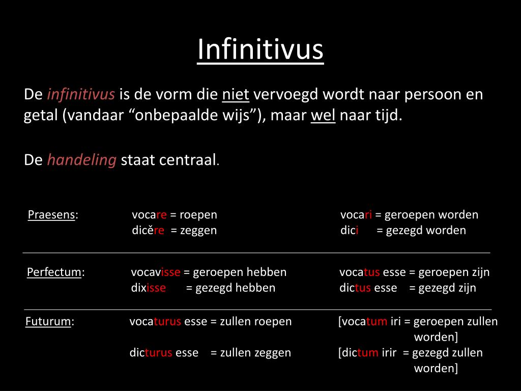 Infinitivus De infinitivus is de vorm die niet vervoegd wordt naar persoon en getal (vandaar “onbepaalde wijs”), maar wel naar tijd. De handeling staat centraal. Praesens: vocare = roepen vocari = geroepen worden dicěre= zeggen dici= gezegd worden Perfectum: vocavisse= geroepen hebben vocatusesse = geroepen zijn dixisse= gezegd hebben dictusesse = gezegd zijn Futurum: vocaturusesse = zullen roepen [vocatumiri = geroepen zullen worden] dicturusesse = zullen zeggen [dictum irir = gezegd zullen worden]
