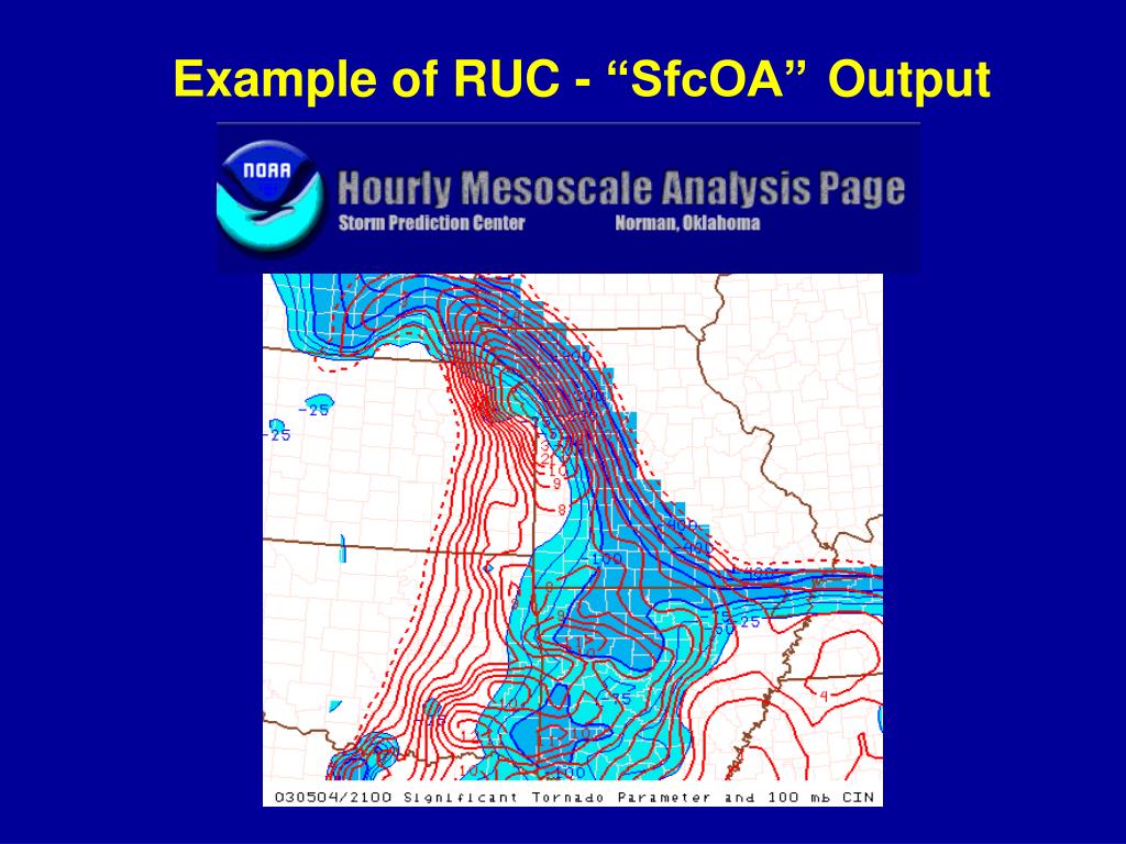 NWP / Technology Advances in the 1990s • NWP and Computer Workstations • Eta and RUC Models • Rapid increases in model resolution, physics complexity, model frequency, amount of output, and skill levels • For the first time, models became useful sources of information for short-term convective forecasting (severe storm watches) • Output complemented real-time observational data • Model forecasts of key convective parameters such as CAPE, vertical shear, and helicity • Forecasters could more directly identify synoptic / mesoscale environments favorable for supercell development • Advanced Operational Workstations • National-center AWIPS (NAWIPS) • Designed to display gridded model data plus observational data