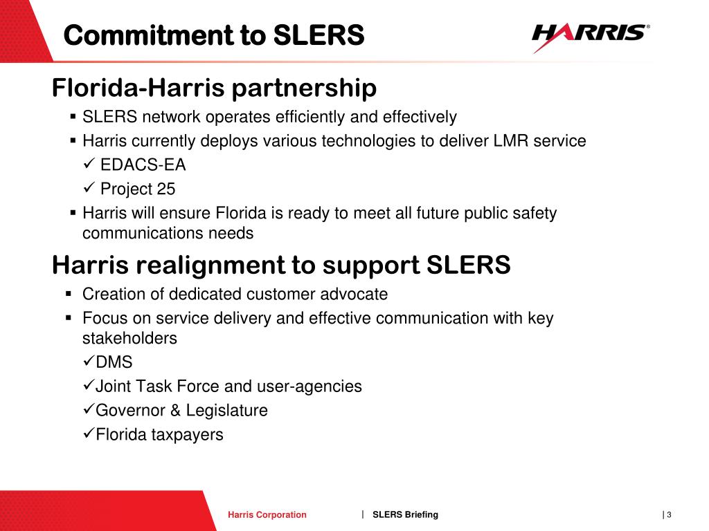 Joint Task Force . SLERS Briefing. February 26, 2013. Commitment to Florida. Commitment to SLERS. Florida-Harris partnership SLERS network operates efficiently and effectively Harris currently deploys various technologies to deliver LMR service EDACS-EA Project 25