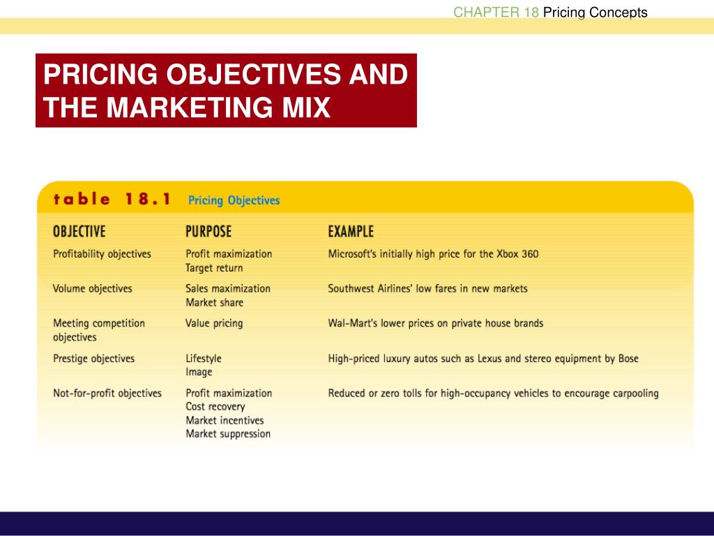 Pricing Concepts. CHAPTER 18. Chapter Objectives. Outline the legal constraints on pricing. Identify the major categories of pricing objectives. Explain price elasticity and its determinants. List the practical problems involved in applying price theory concepts to actual pricing decisions.