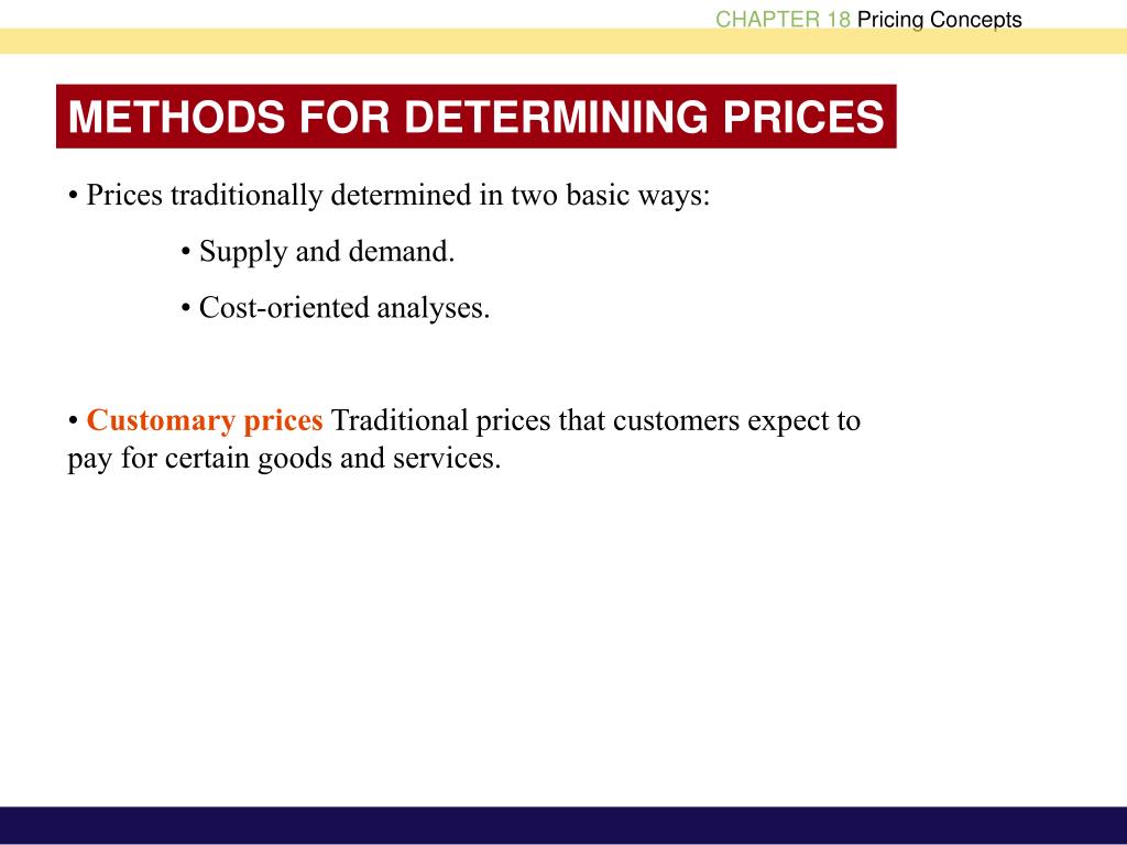 METHODS FOR DETERMINING PRICES • Prices traditionally determined in two basic ways: • Supply and demand. • Cost-oriented analyses. • Customary prices Traditional prices that customers expect to pay for certain goods and services.