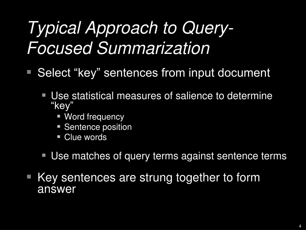 Typical Approach to Query-Focused Summarization • Select “key” sentences from input document • Use statistical measures of salience to determine “key” • Word frequency • Sentence position • Clue words • Use matches of query terms against sentence terms • Key sentences are strung together to form answer