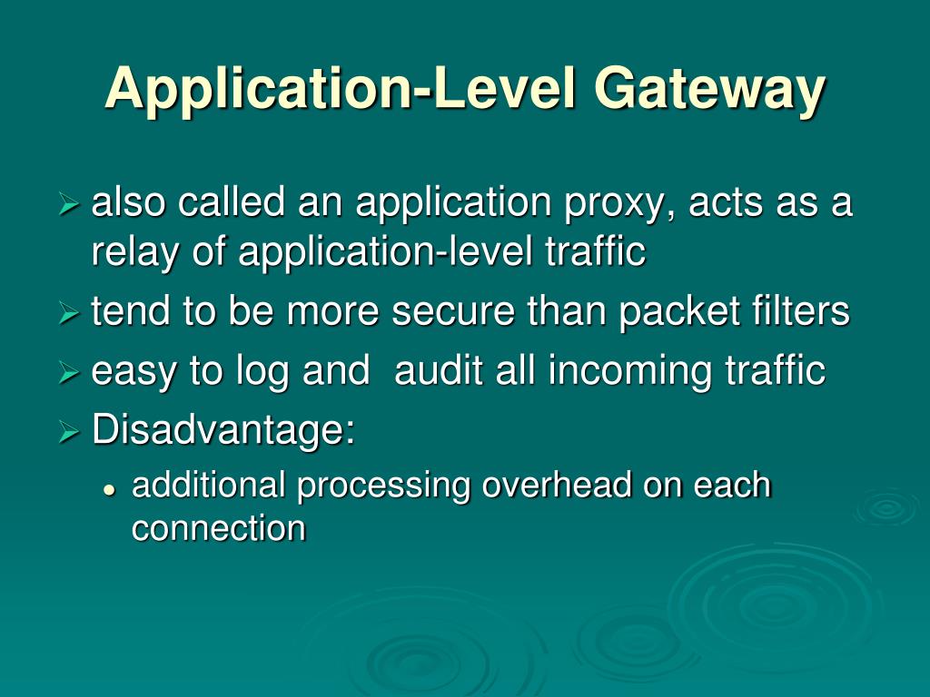 Application-Level Gateway • also called an application proxy, acts as a relay of application-level traffic • tend to be more secure than packet filters • easy to log and audit all incoming traffic • Disadvantage: • additional processing overhead on each connection