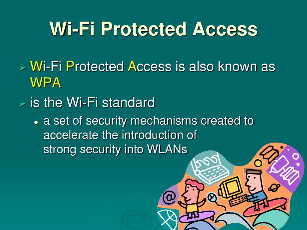 Wi-Fi Protected Access • Wi-Fi Protected Access is also known as WPA • is the Wi-Fi standard • a set of security mechanisms created to accelerate the introduction of strong security into WLANs
