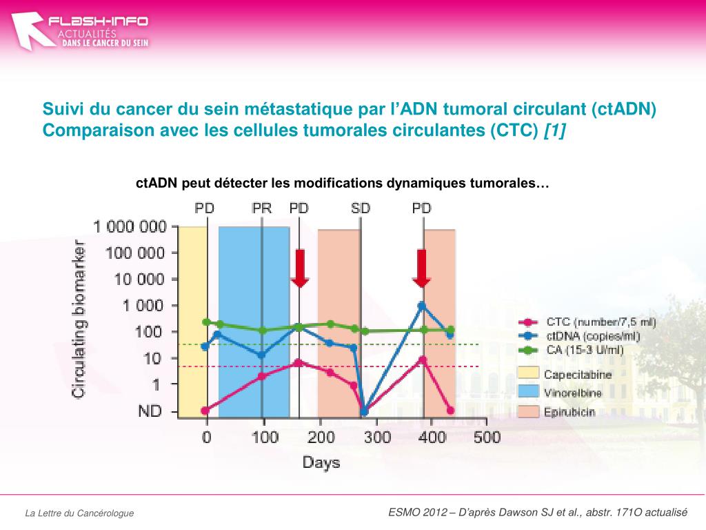 Suivi du cancer du sein métastatique par l’ADN tumoral circulant (ctADN) Comparaison avec les cellules tumorales circulantes (CTC) [1] ctADN peut détecter les modifications dynamiques tumorales… ESMO 2012 – D’après Dawson SJ et al., abstr. 171O actualisé