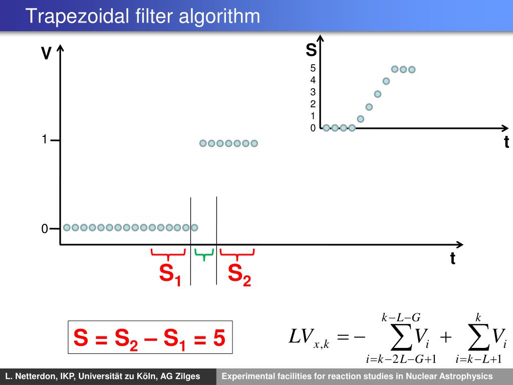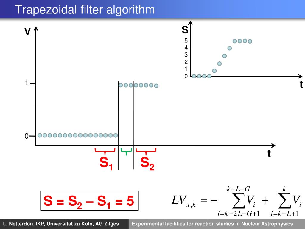 Trapezoidal filter algorithm V S 5 4 3 2 1 0 1 0 t t S1 S2 S = S2 – S1 = 3