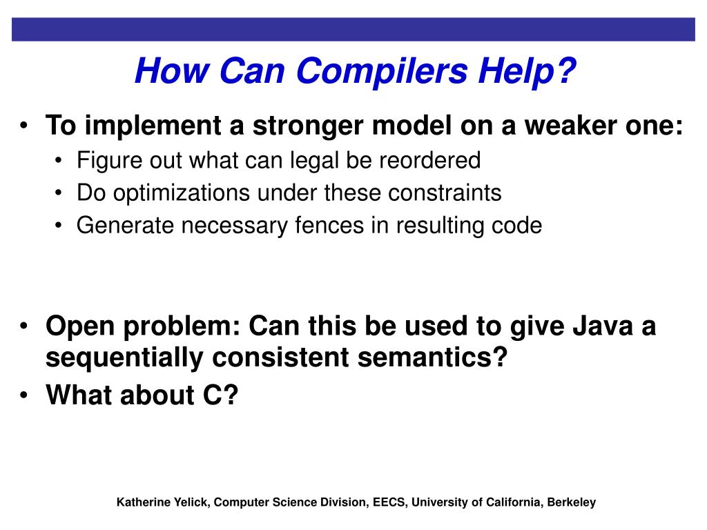 How Can Compilers Help? • To implement a stronger model on a weaker one: • Figure out what can legal be reordered • Do optimizations under these constraints • Generate necessary fences in resulting code • Open problem: Can this be used to give Java a sequentially consistent semantics? • What about C?