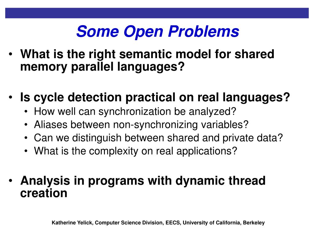 Some Open Problems • What is the right semantic model for shared memory parallel languages? • Is cycle detection practical on real languages? • How well can synchronization be analyzed? • Aliases between non-synchronizing variables? • Can we distinguish between shared and private data? • What is the complexity on real applications? • Analysis in programs with dynamic thread creation