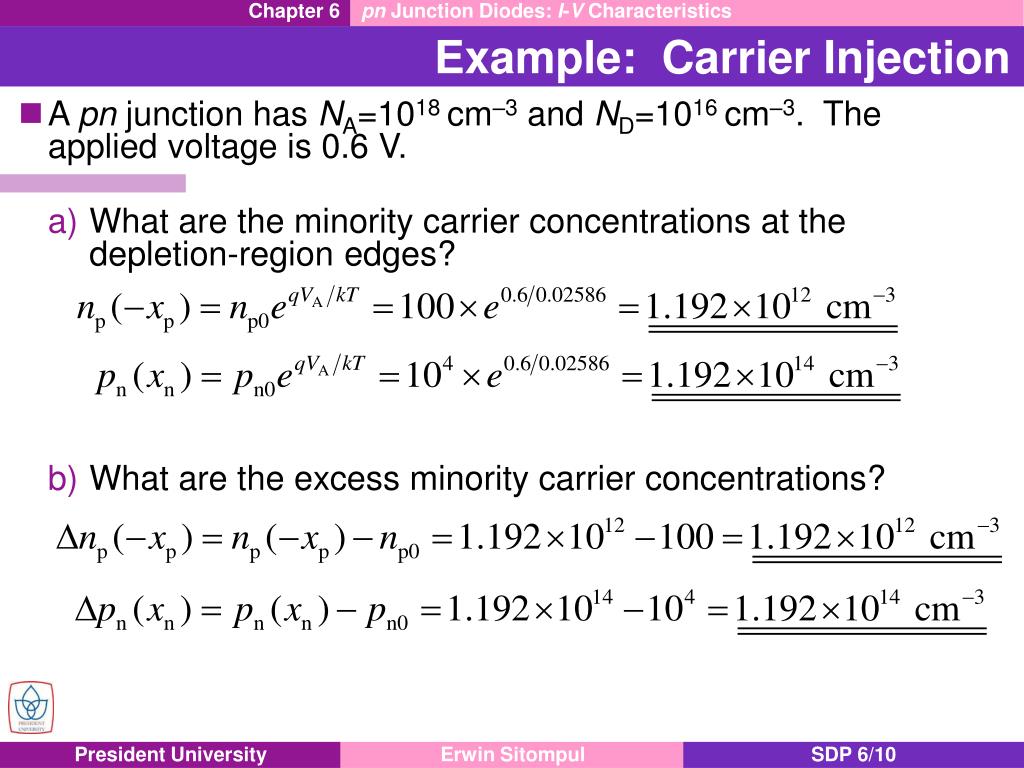 Chapter 6 pn Junction Diodes: I-V Characteristics Example: Carrier Injection • A pn junction has NA=1018 cm–3 and ND=1016 cm–3. The applied voltage is 0.6 V. • a) What are the minority carrier concentrations at the depletion-region edges? • b) What are the excess minority carrier concentrations?