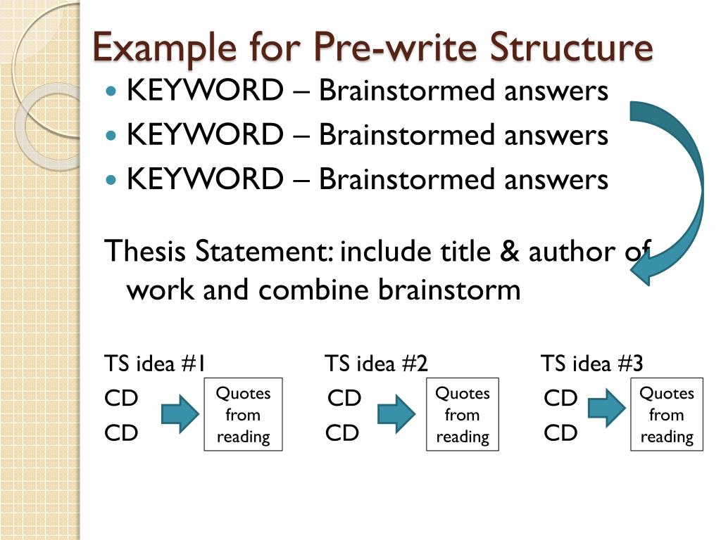 Example for Pre-write Structure • KEYWORD – Brainstormed answers • KEYWORD – Brainstormed answers • KEYWORD – Brainstormed answers Thesis Statement: include title & author of work and combine brainstorm TS idea #1 TS idea #2 TS idea #3 CD CDCD CD CDCD Quotes from reading Quotes from reading Quotes from reading