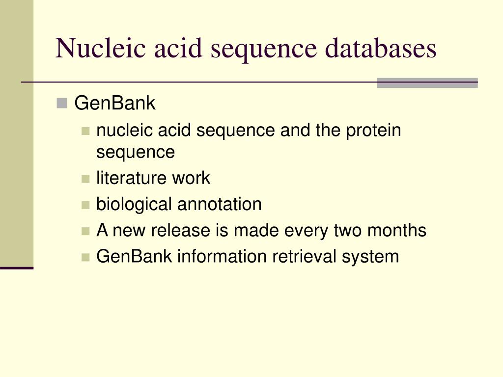 Nucleic acid sequence databases • GenBank • nucleic acid sequence and the protein sequence • literature work • biological annotation • A new release is made every two months • GenBank information retrieval system