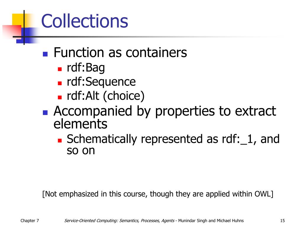 Collections • Function as containers • rdf:Bag • rdf:Sequence • rdf:Alt (choice) • Accompanied by properties to extract elements • Schematically represented as rdf:_1, and so on [Not emphasized in this course, though they are applied within OWL] Service-Oriented Computing: Semantics, Processes, Agents - Munindar Singh and Michael Huhns