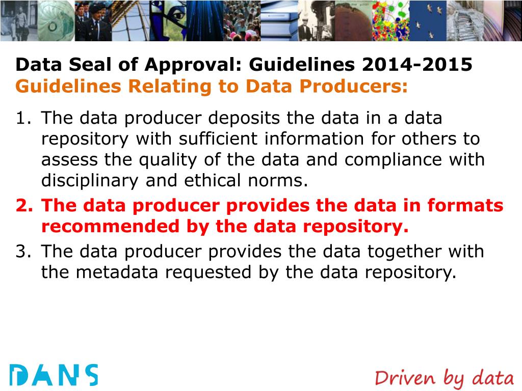 Data Seal of Approval: Guidelines 2014-2015Guidelines Relating to Data Producers: • The data producer deposits the data in a data repository with sufficient information for others to assess the quality of the data and compliance with disciplinary and ethical norms. • The data producer provides the data in formats recommended by the data repository. • The data producer provides the data together with the metadata requested by the data repository.