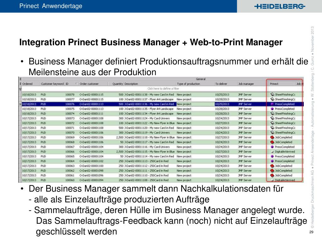 Prinect Business Manager – Feedbackdarstellung im Produktionsmonitor ● Prinect Anwendertage - Automatisierung ● W. Stoltenberg / C. Gumz ● November 2013