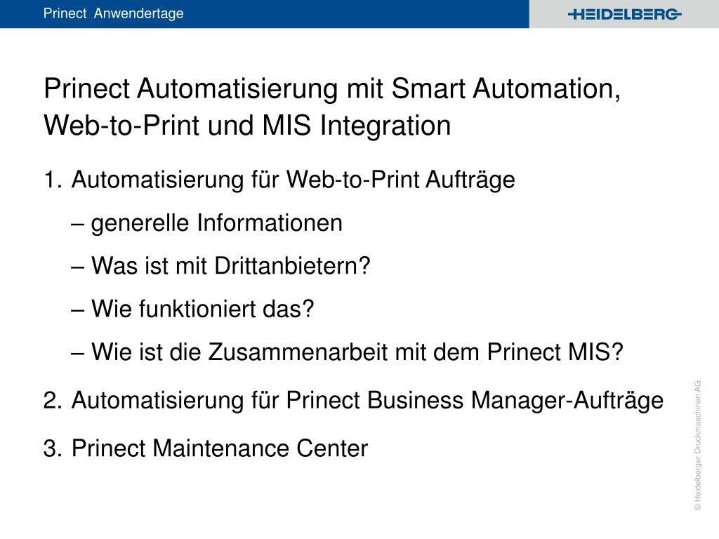 Prinect Automatisierung mit Smart Automation, Web-to-Print und MIS Integration • Automatisierung für Web-to-Print Aufträge – generelle Informationen– Was ist mit Drittanbietern?– Wie funktioniert das?– Wie ist die Zusammenarbeit mit dem Prinect MIS? • Automatisierung für Prinect Business Manager-Aufträge • Prinect Maintenance Center