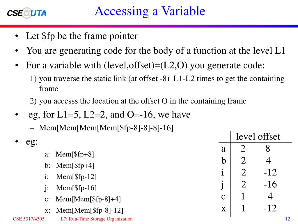 Variable Offsets procedure P ( c: integer ) x: integer; procedure Q ( a, b: integer ) i, j: integer; begin x := x+a+j; end; begin Q(x,c); end;