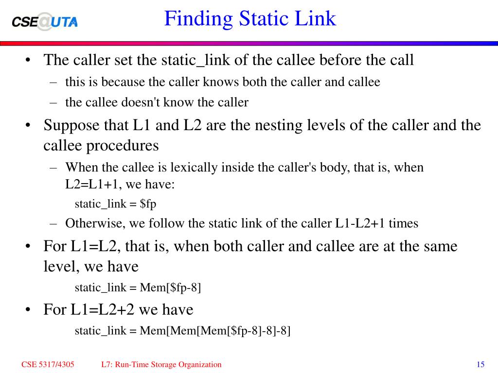 Finding Static Link • The caller set the static_link of the callee before the call • this is because the caller knows both the caller and callee • the callee doesn't know the caller • Suppose that L1 and L2 are the nesting levels of the caller and the callee procedures • When the callee is lexically inside the caller's body, that is, when L2=L1+1, we have: static_link = $fp • Otherwise, we follow the static link of the caller L1-L2+1 times • For L1=L2, that is, when both caller and callee are at the same level, we have static_link = Mem[$fp-8] • For L1=L2+2 we have static_link = Mem[Mem[Mem[$fp-8]-8]-8]