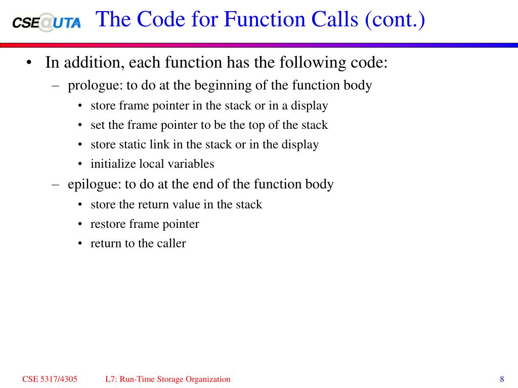 The Code for Function Calls (cont.) • In addition, each function has the following code: • prologue: to do at the beginning of the function body • store frame pointer in the stack or in a display • set the frame pointer to be the top of the stack • store static link in the stack or in the display • initialize local variables • epilogue: to do at the end of the function body • store the return value in the stack • restore frame pointer • return to the caller