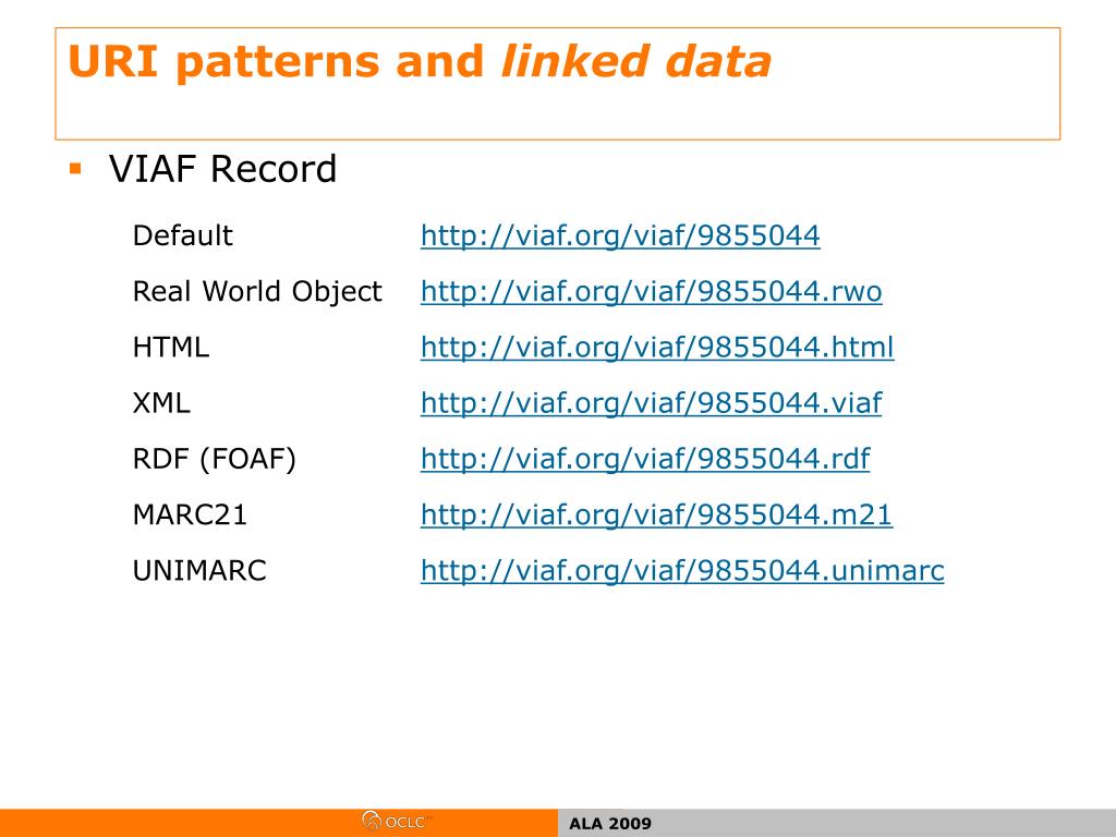 Goals of the Virtual International Authority File • Link national-level authority records • Expand the concept of universal bibliographic control • Allow national or regional variations in authorized form to co-exist • Support needs for variations in preferred language, script and spelling • Play a role in the emerging semantic web