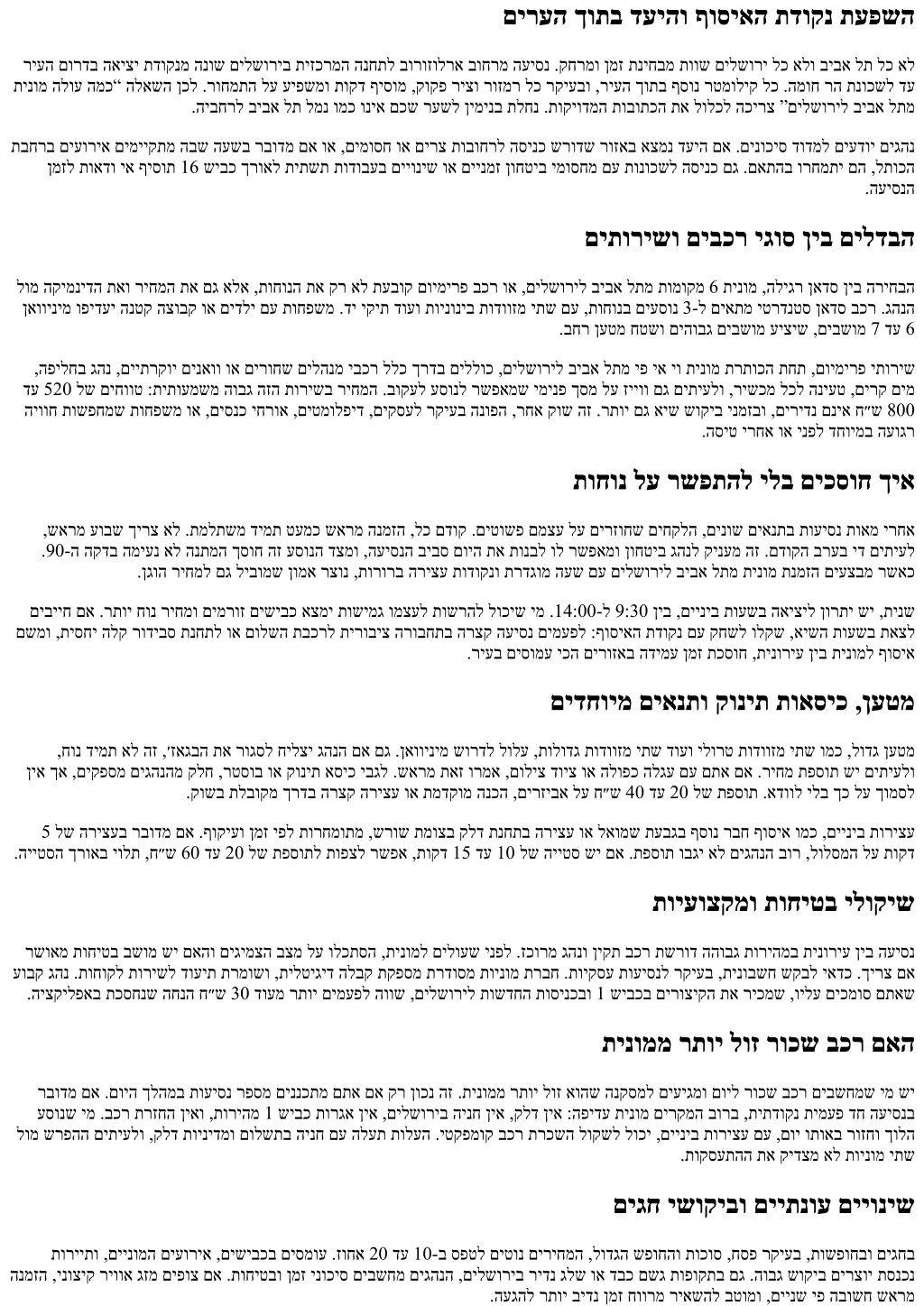 םירעה ךותב דעיהו ףוסיאה תדוקנ תעפשה ריעה םורדב האיצי תדוקנמ הנוש םילשוריב תיזכרמה הנחתל בורוזולרא בוחרמ העיסנ .קחרמו ןמז תניחבמ תווש םילשורי לכ אלו ביבא לת לכ אל תינומ הלוע המכ“ הלאשה ןכל .רוחמתה לע עיפשמו תוקד ףיסומ ,קוקפ ריצו רוזמר לכ רקיעבו ,ריעה ךותב ףסונ רטמוליק לכ .המוח רה תנוכשל דע .היבחרל ביבא לת למנ ומכ וניא םכש רעשל ןימינב תלחנ .תוקיודמה תובותכה תא לולכל הכירצ ”םילשוריל ביבא לתמ תבחרב םיעוריא םימייקתמ הבש העשב רבודמ םא וא ,םימוסח וא םירצ תובוחרל הסינכ שרודש רוזאב אצמנ דעיה םא .םינוכיס דודמל םיעדוי םיגהנ ןמזל תואדו יא ףיסות 16 שיבכ ךרואל תיתשת תודובעב םייוניש וא םיינמז ןוחטיב ימוסחמ םע תונוכשל הסינכ םג .םאתהב ורחמתי םה ,לתוכה .העיסנה םיתורישו םיבכר יגוס ןיב םילדבה לומ הקימנידה תאו ריחמה תא םג אלא ,תוחונה תא קר אל תעבוק םוימירפ בכר וא ,םילשוריל ביבא לתמ תומוקמ 6 תינומ ,הליגר ןאדס ןיב הריחבה ןאווינימ ופידעי הנטק הצובק וא םידלי םע תוחפשמ .די יקית דועו תוינוניב תודווזמ יתש םע ,תוחונב םיעסונ 3-ל םיאתמ יטרדנטס ןאדס בכר .גהנה .בחר ןעטמ חטשו םיהובג םיבשומ עיציש ,םיבשומ 7 דע 6 ,הפילחב גהנ ,םייתרקוי םינאוו וא םירוחש םילהנמ יבכר ללכ ךרדב םיללוכ ,םילשוריל ביבא לתמ יפ יא יו תינומ תרתוכה תחת ,םוימירפ יתוריש דע 520 לש םיחווט :תיתועמשמ הובג הזה תורישב ריחמה .בוקעל עסונל רשפאמש ימינפ ךסמ לע זייוו םג םיתיעלו ,רישכמ לכל הניעט ,םירק םימ היווח תושפחמש תוחפשמ וא ,םיסנכ יחרוא ,םיטמולפיד ,םיקסעל רקיעב הנופה ,רחא קוש הז .רתוי םג איש שוקיב ינמזבו ,םירידנ םניא ח״ש 800 .הסיט ירחא וא ינפל דחוימב העוגר תוחונ לע רשפתהל ילב םיכסוח ךיא ,שארמ עובש ךירצ אל .תמלתשמ דימת טעמכ שארמ הנמזה ,לכ םדוק .םיטושפ םמצע לע םירזוחש םיחקלה ,םינוש םיאנתב תועיסנ תואמ ירחא .90-ה הקדב המיענ אל הנתמה ךסוח הז עסונה דצמו ,העיסנה ביבס םויה תא תונבל ול רשפאמו ןוחטיב גהנל קינעמ הז .םדוקה ברעב יד םיתיעל .ןגוה ריחמל םג ליבומש ןומא רצונ ,תורורב הריצע תודוקנו תרדגומ העש םע םילשוריל ביבא לתמ תינומ תנמזה םיעצבמ רשאכ םיבייח םא .רתוי חונ ריחמו םימרוז םישיבכ אצמי תושימג ומצעל תושרהל לוכיש ימ .14:00-ל 9:30 ןיב ,םייניב תועשב האיציל ןורתי שי ,תינש םשמו ,תיסחי הלק רודיבס תנחתל וא םולשה תבכרל תירוביצ הרובחתב הרצק העיסנ םימעפל :ףוסיאה תדוקנ םע קחשל ולקש ,אישה תועשב תאצל .ריעב םיסומע יכה םירוזאב הדימע ןמז תכסוח ,תינוריע ןיב תינומל ףוסיא םידחוימ םיאנתו קונית תואסיכ ,ןעטמ ,חונ דימת אל הז ,׳זאגבה תא רוגסל חילצי גהנה םא םג .ןאווינימ שורדל לולע ,תולודג תודווזמ יתש דועו ילורט תודווזמ יתש ומכ ,לודג ןעטמ ןיא ךא ,םיקפסמ םיגהנהמ קלח ,רטסוב וא קונית אסיכ יבגל .שארמ תאז ורמא ,םוליצ דויצ וא הלופכ הלגע םע םתא םא .ריחמ תפסות שי םיתיעלו .קושב תלבוקמ ךרדב הרצק הריצע וא תמדקומ הנכה ,םירזיבא לע ח״ש 40 דע 20 לש תפסות .אדוול ילב ךכ לע ךומסל 5 לש הריצעב רבודמ םא .ףוקיעו ןמז יפל תורחמותמ ,שרוש תמוצב קלד תנחתב הריצע וא לאומש תעבגב ףסונ רבח ףוסיא ומכ ,םייניב תוריצע .הייטסה ךרואב יולת ,ח״ש 60 דע 20 לש תפסותל תופצל רשפא ,תוקד 15 דע 10 לש הייטס שי םא .תפסות ובגי אל םיגהנה בור ,לולסמה לע תוקד תויעוצקמו תוחיטב ילוקיש רשואמ תוחיטב בשומ שי םאהו םיגימצה בצמ לע ולכתסה ,תינומל םילועש ינפל .זכורמ גהנו ןיקת בכר תשרוד ההובג תוריהמב תינוריע ןיב העיסנ עובק גהנ .תוחוקל תורישל דועית תרמושו ,תילטיגיד הלבק תקפסמ תרדוסמ תוינומ תרבח .תויקסע תועיסנל רקיעב ,תינובשח שקבל יאדכ .ךירצ םא .היצקילפאב תכסחנש החנה ח״ש 30 דועמ רתוי םימעפל הווש ,םילשוריל תושדחה תוסינכבו 1 שיבכב םירוציקה תא ריכמש ,וילע םיכמוס םתאש תינוממ רתוי לוז רוכש בכר םאה רבודמ םא .םויה ךלהמב תועיסנ רפסמ םיננכתמ םתא םא קר ןוכנ הז .תינוממ רתוי לוז אוהש הנקסמל םיעיגמו םויל רוכש בכר םיבשחמש ימ שי עסונש ימ .בכר תרזחה ןיאו ,תוריהמ 1 שיבכ תורגא ןיא ,םילשוריב הינח ןיא ,
