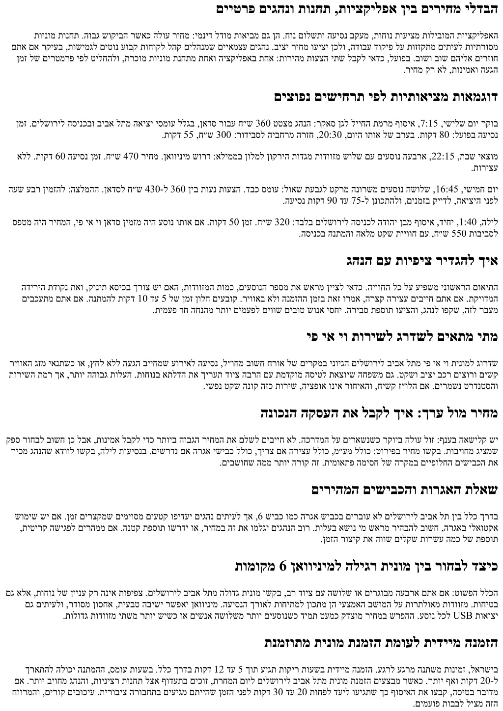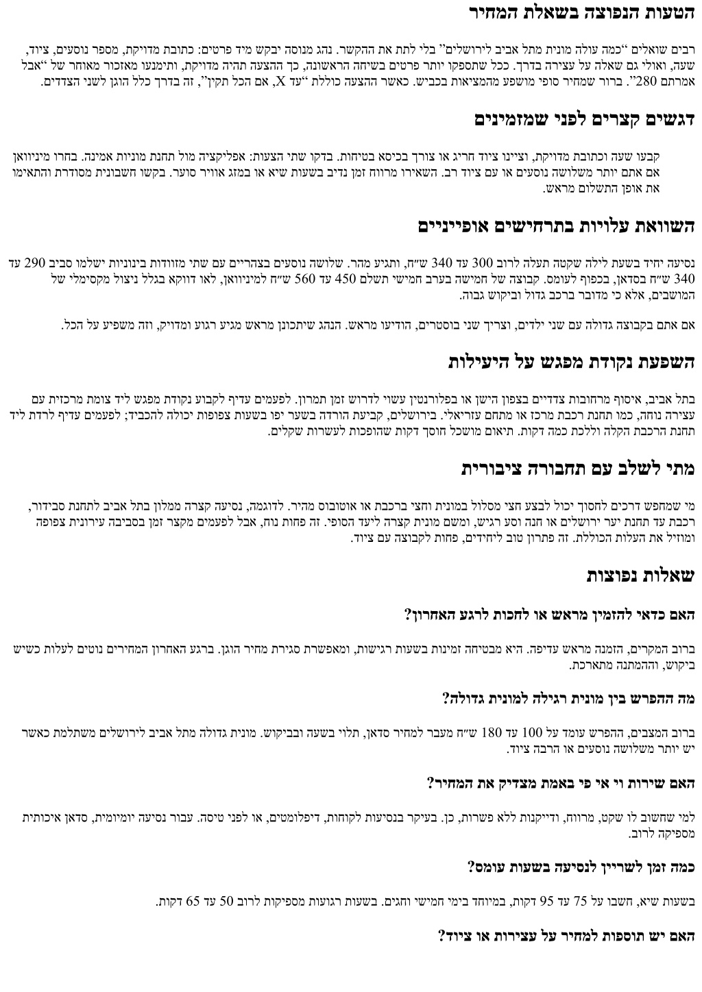 םילשוריל ביבא לת ןיב העיסנ ןימזהל םלתשמ יתמ ריחמה תלאש ,םירעה ןיב ריהמ רבעמ תבייחמש הסיט וא ,תוצח ירחא תמייתסמש 11 רגנאהב העפוה ,הלשממה תיירקב תמדקומ השיגפ וז םא ןיב יולת לעופב ןמזהו ,מ״ק 60 ביבס דמוע םילשוריל הסינכל ביבא לת זכרמ ןיב ימשרה קחרמה .בושו בוש תרזוח םילשוריל ביבא לתמ תינומ לש ,ןעטמ ,ריוואה גזמ ,”וישכע“ תמועל שארמ הנמזה ,בכרה גוס ,העיסנה תעשמ תעפשומ תולעה .דעיהו ףוסיאה תדוקנבו העונתה יסמועב רקיעב תייווח לע רומשלו טעמ אל ךוסחל חילצמ םיפירעתה לש הקימנידה תא ןיבמש ימ ,םיעסונו םיגהנ םע חטשב ןויסינמ .םיקקפהו העיסנה ביתנ ןבומכו .העוגר העיסנ ףאו םילשוריל ביבא לתמ הלודג תינומל הליגר תינומ ןיב םילדבהה ,הממיה ךרואל תדדוב העיסנל םיילאירה םיריחמה יחווט תא תנחוב הבתכה םירפסמ םע ,הרורב הגצה איה הרטמה .שארמ םילשוריל ביבא לתמ תינומ תנמזה עצבל םלתשמ יתמו ,םילשוריל ביבא לתמ יפ יא יו תינומל .םיגחב םעפ קר אל ,שדוחב םימעפ המכ תינומ ןימזמש ימל םייתימא םישיגרמש לעופב ריחמה תא עבוק המ עבקנ לעופב ריחמה .לודג דימת אל םהיניב רעפהו ,םיצופנ םילדומה ינש ,תואיצמב .הנומ םיפידעמש םיגהנ שיו ”עובק ריחמ“ םישקבמש םיעסונ שי .איש שוקיב ןמזב תשחרתמ הנמזהה םאהו בכר גוס ,םיסמוע ,םיריהמ םישיבכב הריחב ,לולסמה ךרוא ,האיצי ןמז :אבה בולישה יפל ךשמיהל הלולע העיסנה ,18:30 דע 15:30 ,םיירהצה רחא תועשבו ,9:30-ל 6:45 ןיב ,רקובב אישה תועשב .יטננימודה רטמרפה איה האיציה תעש סמוע תועשב רתוי ההובג תולעל םגרתימ הז ינוש .תוקד 55 דע 45-ב םיתיעל ךרדה תא רובעל ןתינ ,תאז תמועל ,הלילה תועשב .תוקד 95 דע 65 .ונמז תא רחמתמ גהנה יכ ,עובק ריחמ לדומב םגו ,םיקקפב הנתמה ןמז ללגב הנומ לדומב םג הלעת םיבשומ 7 ןאווינימ וא םילשוריל ביבא לתמ תומוקמ 6 תינומ דועב ,רתוי הלוז תיטרדנטס ןאדס תינומ :תורישי העיפשמ בכרה גוסב הריחב אל ,ירמגל רחא רצומכ ללכ ךרדב ,רתוי דוע הובג רחמותי יתרקוי ןאוו וא םילהנמ בכרב םוימירפ תוריש .תודווזמל בחרמו ,תוחונ ,הסופת לשב רתוי .”הנטק תפסות”כ הממיה תועש יפל םיריחמ יחווט ויהי דימת .םיעובק םיגהנ םע ”ישפוח“ תועיסנ דצל ,םילשוריו זכרמב תוליעפ תוינומ תורבח ברקב םיצופנש םיחווט םיפקשמ םיאבה םירפסמה :םיבוט סוחיי יכרע ולא ךא ,ןפוד יאצוי ןיידע םישיבכה הבש העשב רבודמ .ןאדס בכרל ח״ש 320 דע 260 לש חווטב תרחמותמ העיסנה ללכ ךרדב :6:30 דע 5:00 ,תוטקש רקוב תועש תונימז ללגב טעמ ספטל לולע ריחמה ,רחשה תולע ינפל הריהמ הנמזהב רבודמ םא .שארמ ןימזמש חוקל לש תואדווה תא םיכירעמ םיגהנהו ,םימרוז .הכומנ םירוזאמ ףוסיאב רבודמשכ ח״ש 400-ל םג םיתיעלו ,תיטרדנטס תינומל ח״ש 380 דע 300-ל בורל הלוע רוחמתה :9:30 דע 6:45 ,רקובה איש ,ח״ש 520 דע 420 שקבל גוהנ תומוקמ 7 דע 6 ןאוו וא הלודג תינומ לע .םילשוריב תופופצ תונוכשב הדרוהב וא ,ביבא לת זכרמב דחוימב םיסומע .תודווזמ שי םא דחוימב שי גהנל םא קודבל יאדכ ןאכ .ח״ש 340 דע 270 ביבס םיענ ןאדס יריחמ .םיעסונל םגו םיגהנל םג חונ ןמז ןולח והז :14:30 דע 9:30 ,םייניב תועש .ח״ש 470-ל 380 ןיב ללכ ךרדב רחמותת הלודג תינומ .ריחמב טעמ דירוהל ול רשפאמ הז םיתיעל ,הרזח העיסנ רבכ ףלחמ וא אצומ רוזאב דחוימב תיטיא הזוזתו ,1 שיבכב תויאשמ ,םינוויכה ינשמ העונת יסמוע .ינחלס יתלב ןולח והז :18:30 דע 15:30 ,צ״החא איש .ח״ש 560 דע 450 בורל הלוע םיבשומ 7 דע 6 ןאווינימ .רתוי םיתיעל ,ח״ש 420 דע 320-ל םיצפקמ ןאדס יריחמ .הבנע תויתדונת תמשרנ תבש יאצומבו ישימח ימיב .ח״ש 350 דע 280-ל בורל םירזוח ןאדסה יריחמ :22:30 דע 19:00 ,הדובעה רחאל תועשו ברע .ח״ש 500-ל 400 ןיב חווטת הלודג תינומ .עובש עצמא תמועל ח״ש 60 דע 30-ב תולעל לולע ריחמה ;םייוליבו םיעוריא לשב ההובג שקבמש ימ .ח״ש 380 דע 300 ביבס ללכ ךרדב ענ ןאדס ריחמ .הכומנ םיגהנה תונימז ךא ,םירצקתמ העיסנה ינמז :4:30 דע 23:00 ,רחואמ הליל 430-ב בורל רחמותת הלילב הלודג תינומ .תונימז תיימרפ םלשמ םילשוריב ןולמ תיב וא ינש הפועת הדשל רקוב תונפל 2:30 העשב קיודמ ףוסיא .ח״ש 540 דע עובק ריחמ יתמו ףידע הנומ יתמ ,העיסנ ףוסב חכוותה