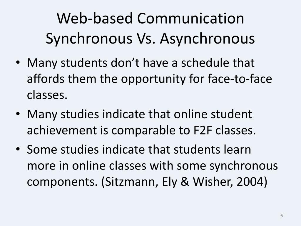Web-based Communication Synchronous Vs. Asynchronous • Many students don’t have a schedule that affords them the opportunity for face-to-face classes. • Many studies indicate that online student achievement is comparable to F2F classes. • Some studies indicate that students learn more in online classes with some synchronous components. (Sitzmann, Ely & Wisher, 2004)