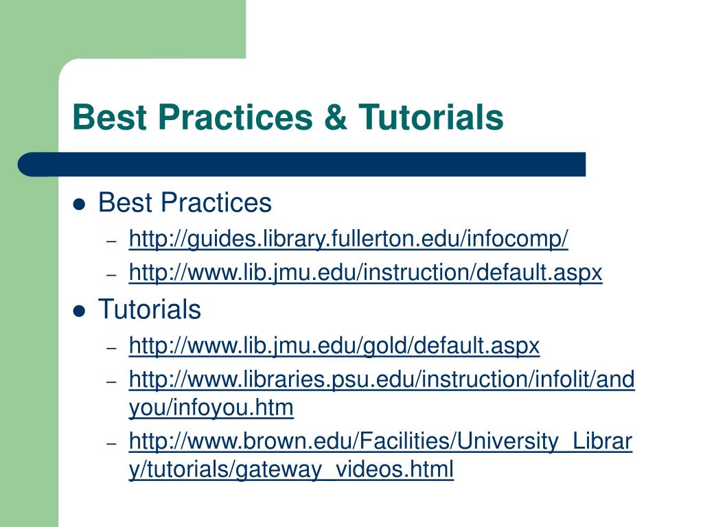Best Practices & Tutorials • Best Practices • http://guides.library.fullerton.edu/infocomp/ • http://www.lib.jmu.edu/instruction/default.aspx • Tutorials • http://www.lib.jmu.edu/gold/default.aspx • http://www.libraries.psu.edu/instruction/infolit/andyou/infoyou.htm • http://www.brown.edu/Facilities/University_Library/tutorials/gateway_videos.html