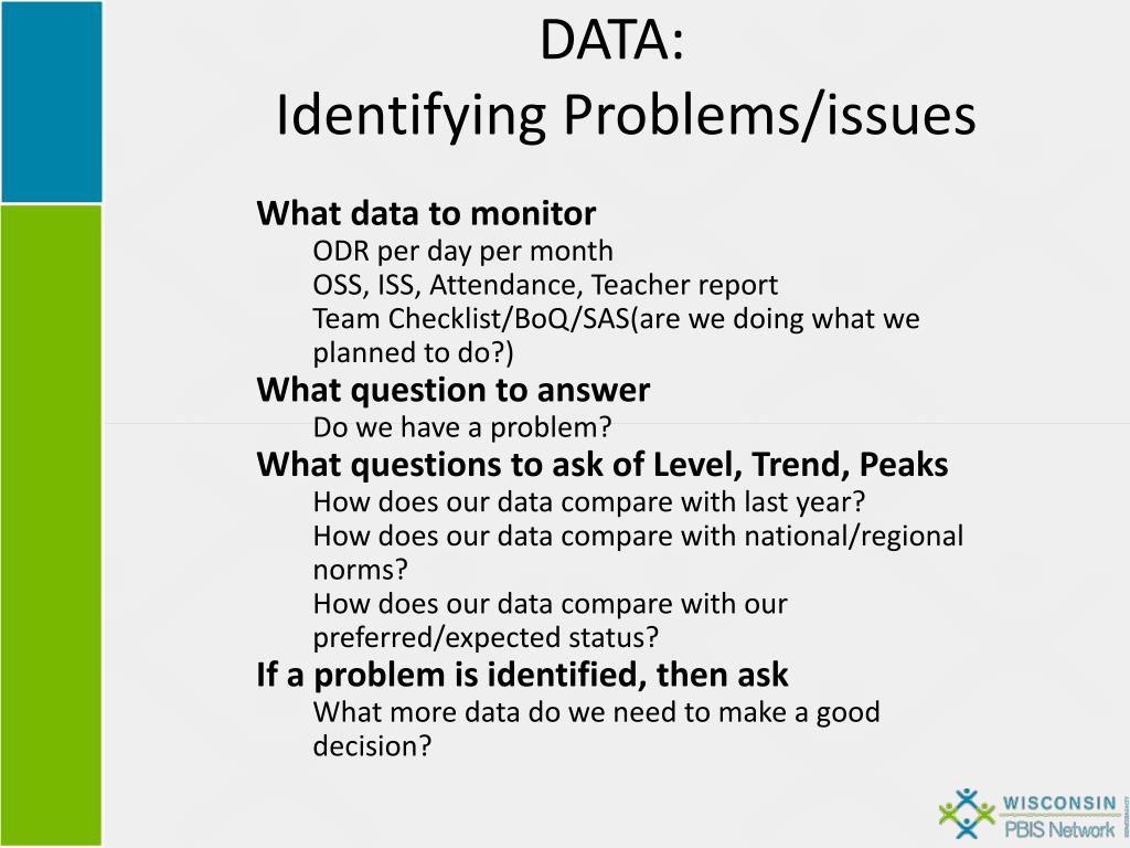DATA: Identifying Problems/issues • What data to monitor • ODR per day per month • OSS, ISS, Attendance, Teacher report • Team Checklist/BoQ/SAS(are we doing what we planned to do?) • What question to answer • Do we have a problem? • What questions to ask of Level, Trend, Peaks • How does our data compare with last year? • How does our data compare with national/regional norms? • How does our data compare with our preferred/expected status? • If a problem is identified, then ask • What more data do we need to make a good decision?