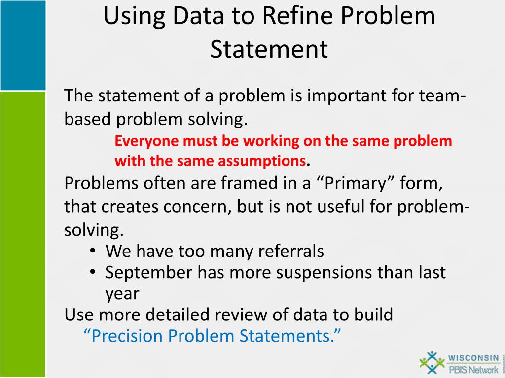 Using Data to Refine Problem Statement • The statement of a problem is important for team-based problem solving. • Everyone must be working on the same problem with the same assumptions. • Problems often are framed in a “Primary” form, that creates concern, but is not useful for problem-solving. • We have too many referrals • September has more suspensions than last year • Use more detailed review of data to build “Precision Problem Statements.”
