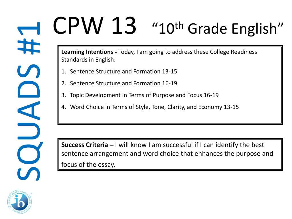 CPW 13 Learning Intentions - Today, I am going to address these College Readiness Standards in English: Sentence Structure and Formation 13-15 Sentence Structure and Formation 16-19 Topic Development in Terms of Purpose and Focus 16-19 Word Choice in Terms of Style, Tone, Clarity, and Economy 13-15 SQUADS #1 “10th Grade English” Success Criteria – I will know I am successful if I can identify the best sentence arrangement and word choice that enhances the purpose and focus of the essay.