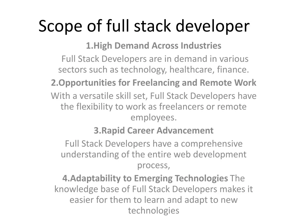 Scope of full stack developer 1.High Demand Across Industries Full Stack Developers are in demand in various sectors such as technology, healthcare, finance. 2.Opportunities for Freelancing and Remote Work With a versatile skill set, Full Stack Developers have the flexibility to work as freelancers or remote employees. 3.Rapid Career Advancement Full Stack Developers have a comprehensive understanding of the entire web development process, 4.Adaptability to Emerging Technologies The knowledge base of Full Stack Developers makes it easier for them to learn and adapt to new technologies
