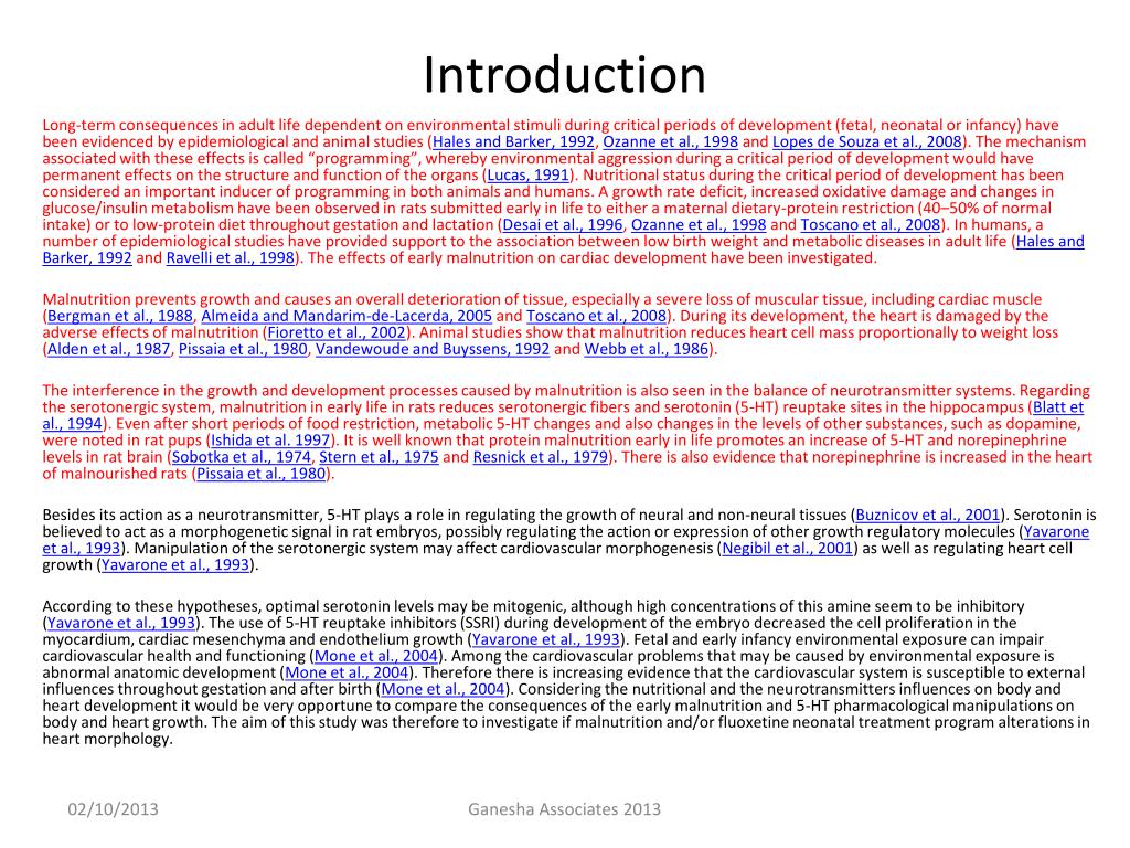 Introduction Considering the nutritional and the neurotransmitters influences on body and heart development it would be very opportune to compare the consequences of the early malnutrition and 5-HT pharmacological manipulations on body and heart growth. The aim of this study was therefore to investigate if malnutrition and/or fluoxetine neonatal treatment program alterations in heart morphology. Ganesha Associates 2013