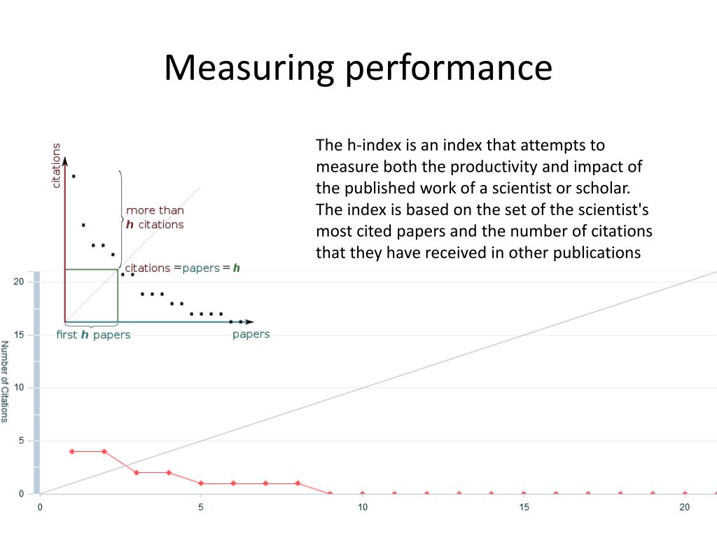 Measuring performance The h-index is an index that attempts to measure both the productivity and impact of the published work of a scientist or scholar. The index is based on the set of the scientist's most cited papers and the number of citations that they have received in other publications
