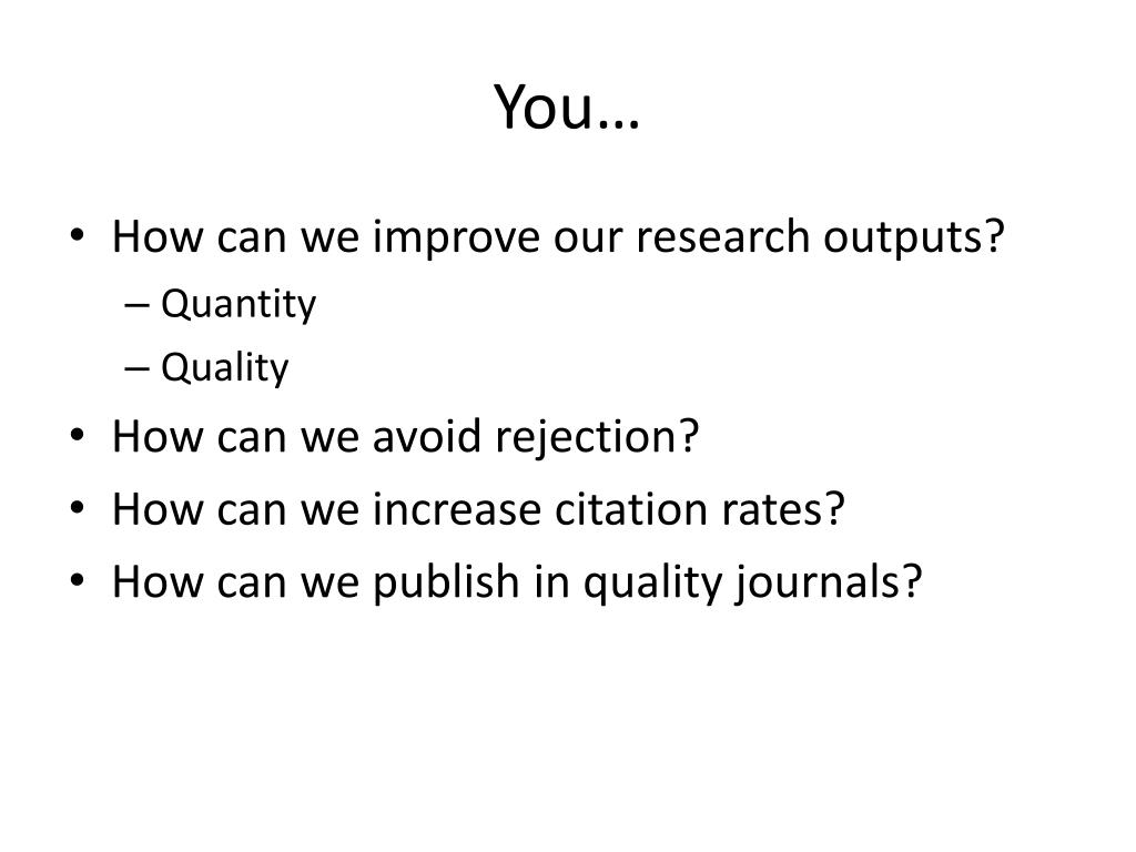 You… • How can we improve our research outputs? • Quantity • Quality • How can we avoid rejection? • How can we increase citation rates? • How can we publish in quality journals?