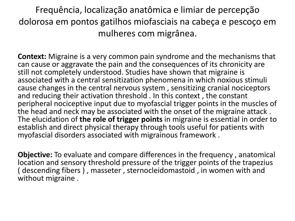 Frequência, localização anatômica e limiar de percepção dolorosa em pontos gatilhos miofasciais na cabeça e pescoço em mulheres com migrânea. Context: Migraine is a very common pain syndrome and the mechanisms that can cause or aggravate the pain and the consequences of its chronicity are still not completely understood. Studies have shown that migraine is associated with a central sensitization phenomena in which noxious stimuli cause changes in the central nervous system , sensitizing cranial nociceptors and reducing their activation threshold . In this context , the constant peripheral nociceptive input due to myofascial trigger points in the muscles of the head and neck may be associated with the onset of the migraine attack . The elucidation of the role of trigger points in migraine is essential in order to establish and direct physical therapy through tools useful for patients with myofascial disorders associated with migrainous framework . Objective: To evaluate and compare differences in the frequency , anatomical location and sensory threshold pressure of the trigger points of the trapezius ( descending fibers ) , masseter , sternocleidomastoid , in women with and without migraine .