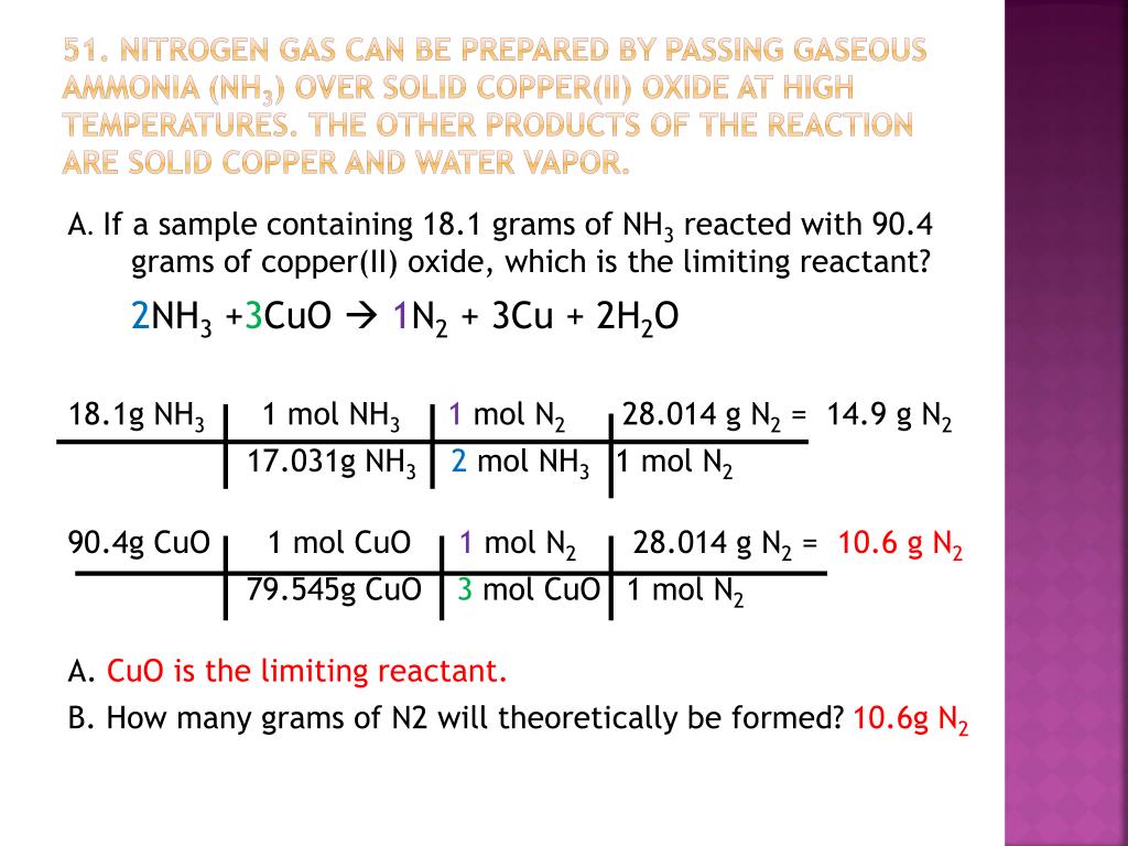 51. Nitrogen gas can be prepared by passing gaseous ammonia (NH3) over solid copper(II) oxide at hightemperatures. The other products of the reaction are solid copper and water vapor. A. If a sample containing 18.1 grams of NH3 reacted with 90.4 grams of copper(II) oxide, which is the limiting reactant? 2NH3 +3CuO 1N2 + 3Cu + 2H2O 18.1g NH3 1 mol NH31 mol N2 28.014 g N2 = 14.9 g N2 17.031g NH3 2 mol NH3 1 mol N2 90.4g CuO 1 mol CuO 1 mol N2 28.014 g N2 = 10.6 g N2 79.545g CuO 3 mol CuO 1 mol N2 A. CuO is the limiting reactant. B. How many grams of N2 will theoretically be formed? 10.6g N2
