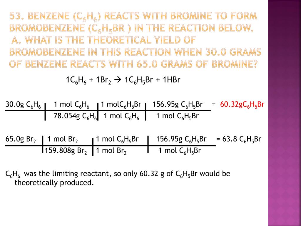 53. Benzene (C6H6) reacts with bromine to form bromobenzene (C6H5Br ) in the reaction below. A. What is the theoretical yield of bromobenzene in this reaction when 30.0 grams of benzene reacts with 65.0 grams of bromine? 1C6H6 + 1Br2 1C6H5Br + 1HBr 30.0g C6H6 1 mol C6H6 1 molC6H5Br 156.95g C6H5Br = 60.32gC6H5Br 78.054g C6H6 1 mol C6H6 1 mol C6H5Br 65.0g Br2 1 mol Br2 1 mol C6H5Br 156.95g C6H5Br = 63.8 C6H5Br 159.808g Br2 1 mol Br2 1 mol C6H5Br C6H6 was the limiting reactant, so only 60.32 g of C6H5Br would be theoretically produced.