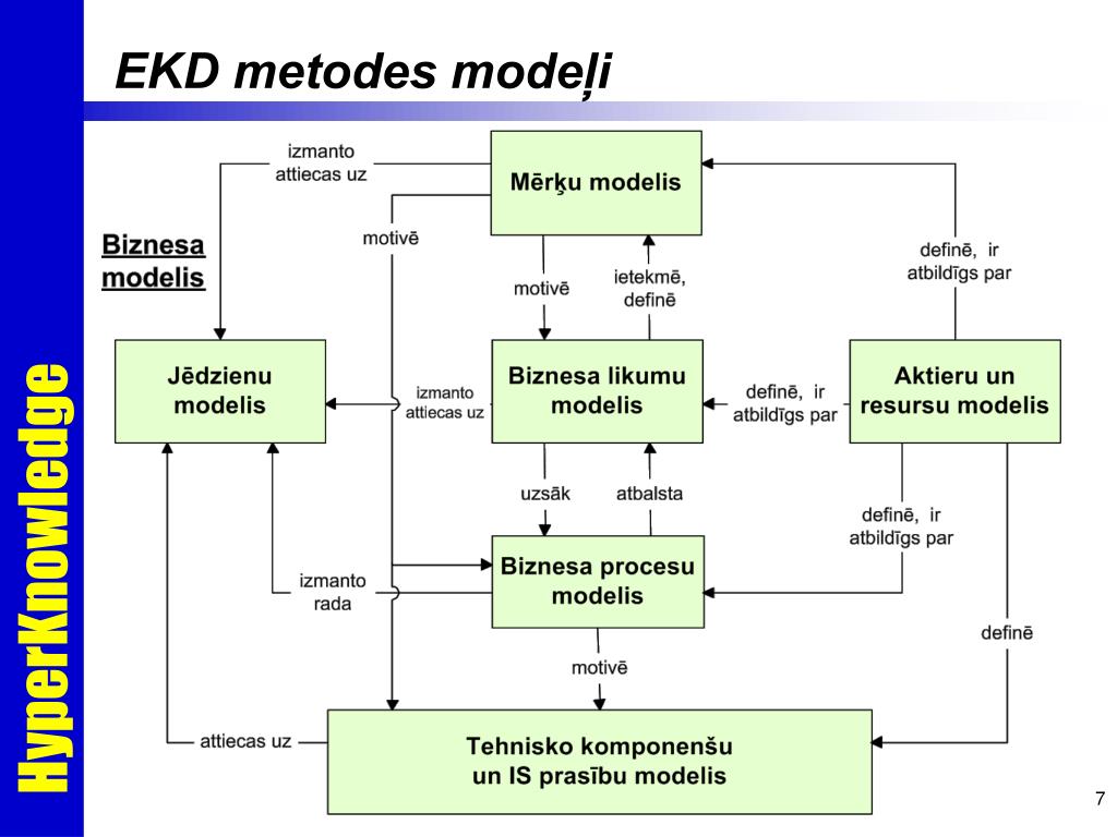 E nterprise K nowledge D evelopment ( EKD ) Modelēšanas metode. Pēc Zviedrijas Karaliskajā Tehnoloģiju Institūtā (KTH) izstrādātajiem materiāliem. EKD metode tiek lietota. ES proj ektos : ELEKTRA HYPERBANK F3 NATURE FP5 HyperKnowledge